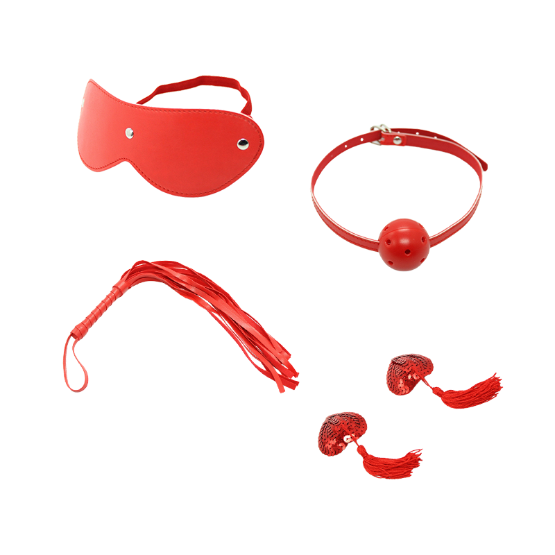 - Includes: whip, blindfold, mouth gag, and tassel nipple covers
